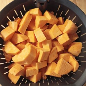 Eplucher et couper les patates douces en cubes de 1-2cm. Mettre dans le panier cuisson.