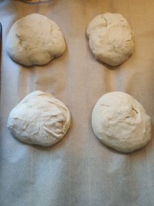 Saupoudrer vos mains de farine, partager la pâte en boules égales au nombre de personne (environ 110g par pain) et les disposer sur la grille.